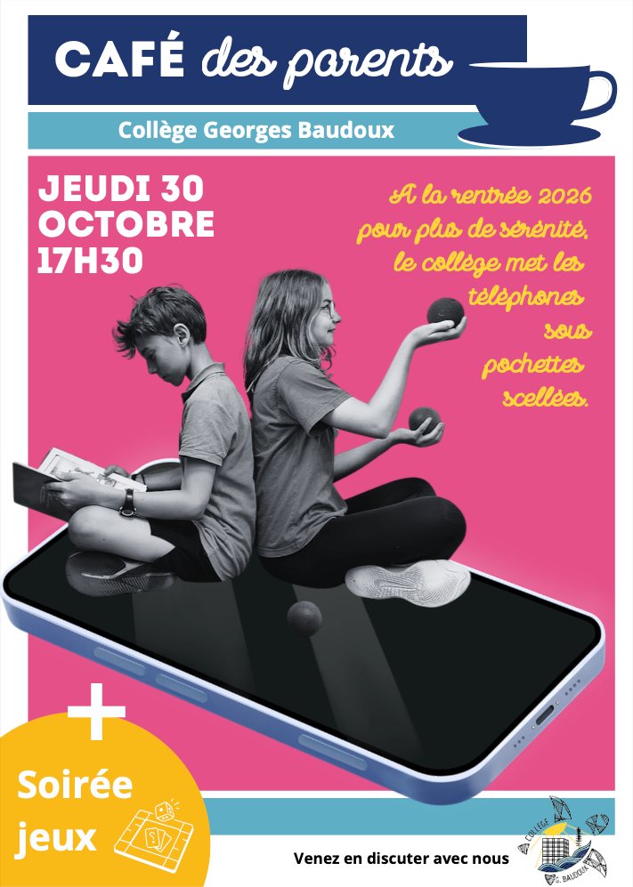 Le jeudi 30 octobre, se tiendra un Café des Parents, nous réfléchirons à l’interdiction des portables à la rentrée 2026 et les conséquences au sein de l’établissement, et à apporter des modifications au règlement intérieur.